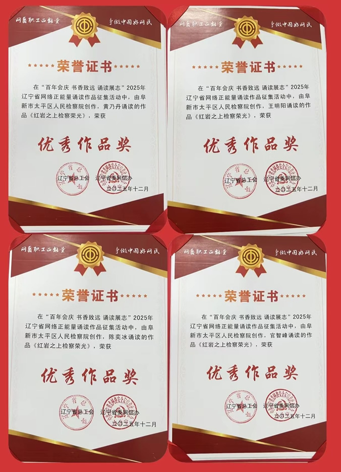 近日,在由辽宁省总工会、辽宁省委网信办联合举办的“百年会庆 书香致远 诵读展志”2025年辽宁省网络正能量诵读作品征集活动中,我院原创的诵读作品《红岩之上检察荣光》凭借深刻的主题内涵、真挚的情感表达与专业的演绎呈现,从全省众多参赛作品中脱颖而出,荣获“优秀作品奖”。